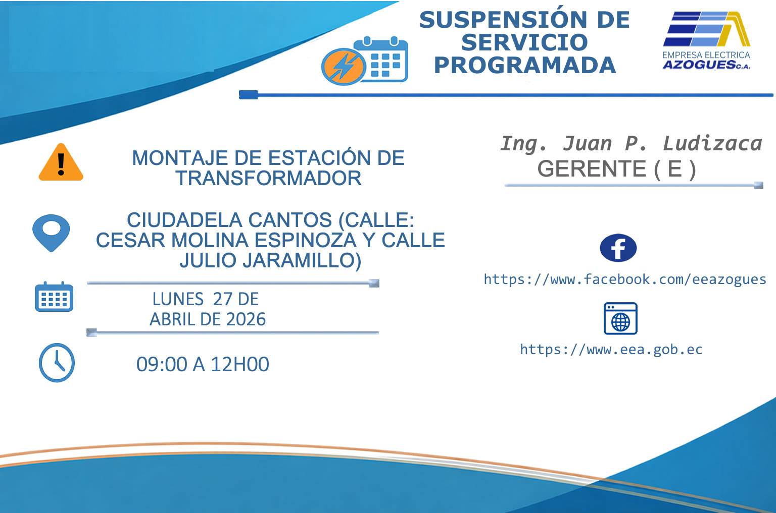 SUSPENSION DE SERVICIO EN LA CIUDADELA CANTOS (CALLE: CESAR MOLINA ESPINOZA Y CALLE JULIO JARAMILLO)