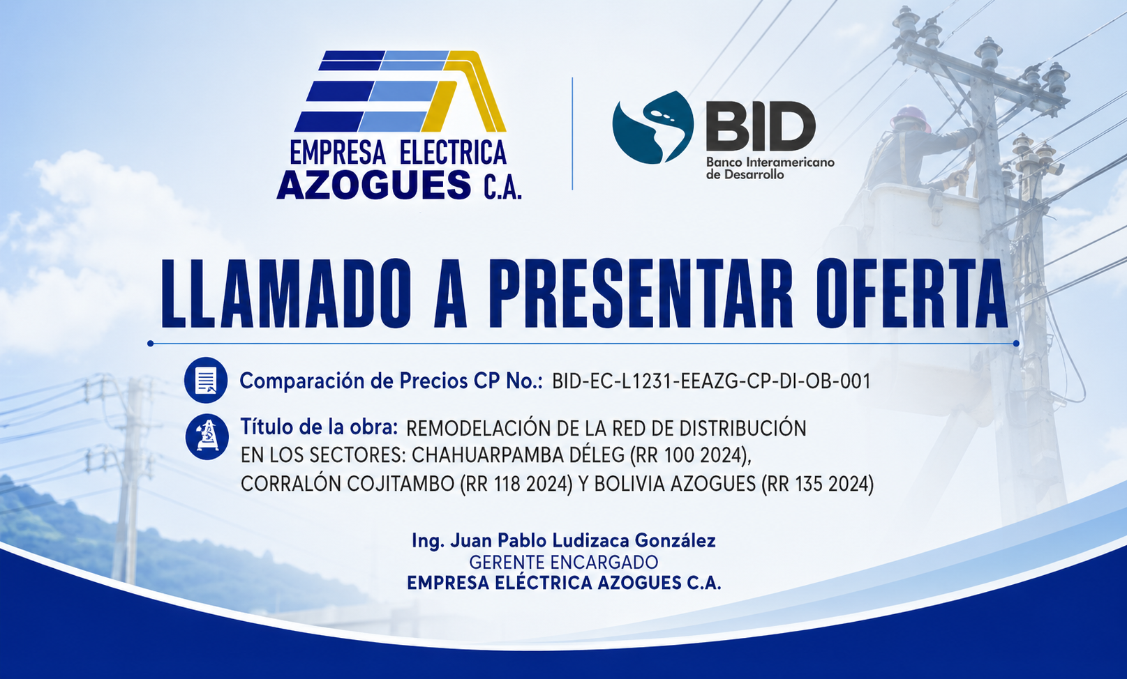 INVITACION A PRESENTAR OFERTAS PARA EMODELACIÓN DE LA RED DE DISTRIBUCIÓN EN LOS SECTORES CHAHUARPAMBA DÉLEG , CORRALÓN COJITAMBO Y BOLIVIA AZOGUES"